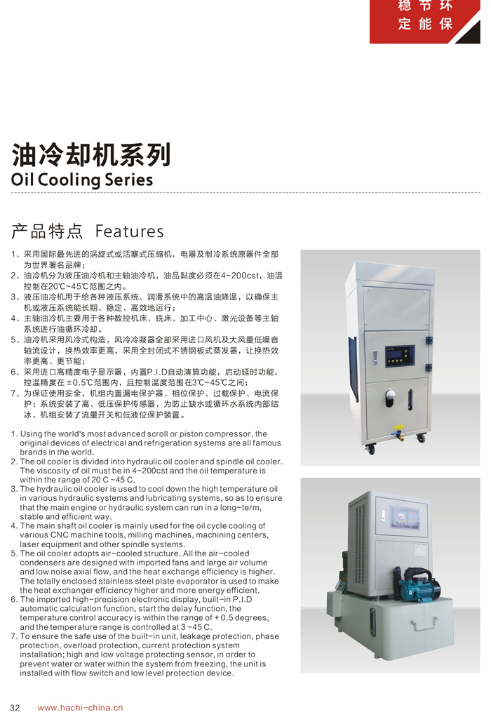 1、制冷能力是在環(huán)境溫度35℃,進油溫度35℃,出油溫度30℃,油品為ISO VG32條件下測得。 2、用戶在選擇油冷機時,必須選擇油液需控制的溫度范圍(1)18℃-25℃ (2)25℃-35℃ (3)35℃-45℃ (4)45℃以上。本公司推薦液壓油合理的溫度控制范圍為35℃-45℃. 3、本機組內置冷卻油箱,接口可用軟硬管連接,且加裝過濾器。 4、機組操作面裝有冷卻液油箱液拉顯示裝置,方便快捷查看液位。 5、機組內部裝有油泵,可根據(jù)需要調節(jié)冷卻液的流量及壓力。 6、機組采用高精度電子顯示器,內置P.I.D自動演算功,延時啟動功能。 7、以上機組使用環(huán)境為5~42℃,42℃以上屬高溫機組,外形尺寸及相關參數(shù)會有所變更,請選型時注意。 8、參數(shù)表內為本公司標準機型,本公司接受客戶非標機器訂做. 適用種類: ◇ CNC車床、銑床、磨床、拉床 ◇ CNC旋轉臺、油壓機、木工雕刻機 ◇ CNC立式/臥式加工中心、綜合切削加工中心 ◇ 高速機械主軸、電主軸、靜壓(動靜壓)主軸 ◇ 各種機械的液壓站及潤滑系統(tǒng) ◇ 放電加工設備、慢走絲、研磨機、試驗室設備、激光設備等..